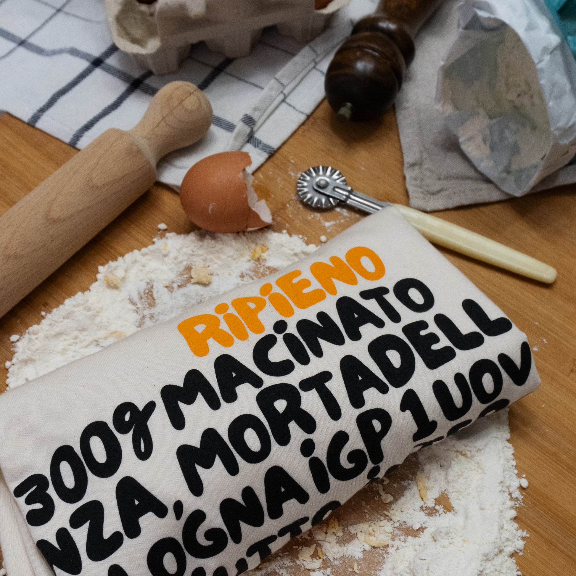 Dietro? La ricetta dei tortellini stampata a tutta schiena, perché certe tradizioni vanno portate addosso con orgoglio – e un pizzico di ironia.